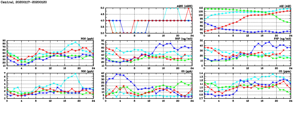 | Air Quality Data Time Series in Central (2020/01/20) | ( Line colors: Day -3 Day -2 Day -1 Current day ) | 2D Map Current AQHI |