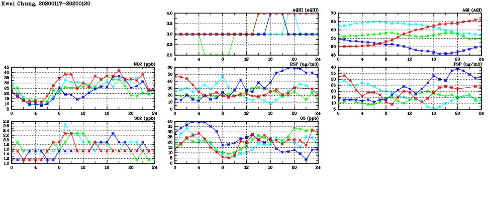 | Air Quality Data Time Series in Kwai Chung (2020/01/20) | ( Line colors: Day -3 Day -2 Day -1 Current day ) | 2D Map Current AQHI |