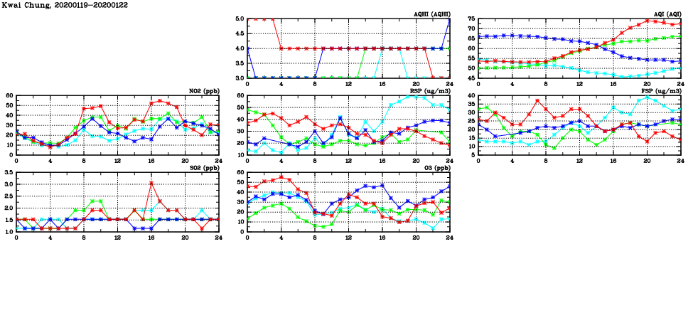 | Air Quality Data Time Series in Kwai Chung (2020/01/22) | ( Line colors: Day -3 Day -2 Day -1 Current day ) | 2D Map Current AQHI |