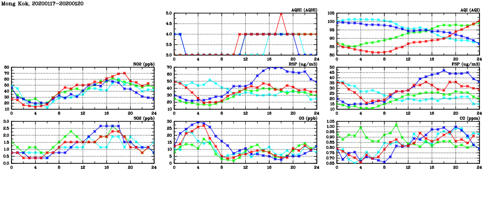 | Air Quality Data Time Series in Mong Kok (2020/01/20) | ( Line colors: Day -3 Day -2 Day -1 Current day ) | 2D Map Current AQHI |