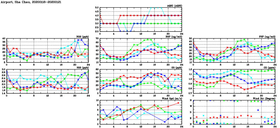 | Air Quality Data Time Series in Airport, Sha Chau (2020/01/21) | ( Line colors: Day -3 Day -2 Day -1 Current day ) | 2D Map Current AQHI |