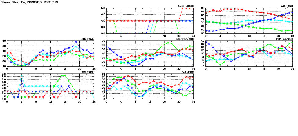 | Air Quality Data Time Series in Sham Shui Po (2020/01/21) | ( Line colors: Day -3 Day -2 Day -1 Current day ) | 2D Map Current AQHI |