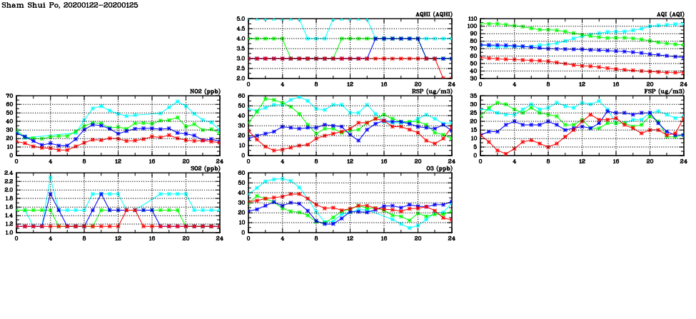 | Air Quality Data Time Series in Sham Shui Po (2020/01/25) | ( Line colors: Day -3 Day -2 Day -1 Current day ) | 2D Map Current AQHI |