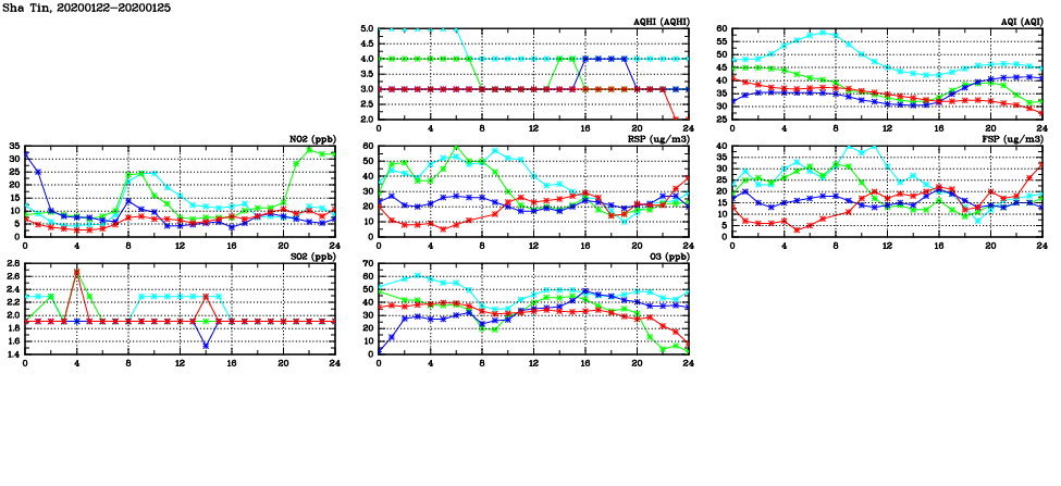 | Air Quality Data Time Series in Sha Tin (2020/01/25) | ( Line colors: Day -3 Day -2 Day -1 Current day ) | 2D Map Current AQHI |