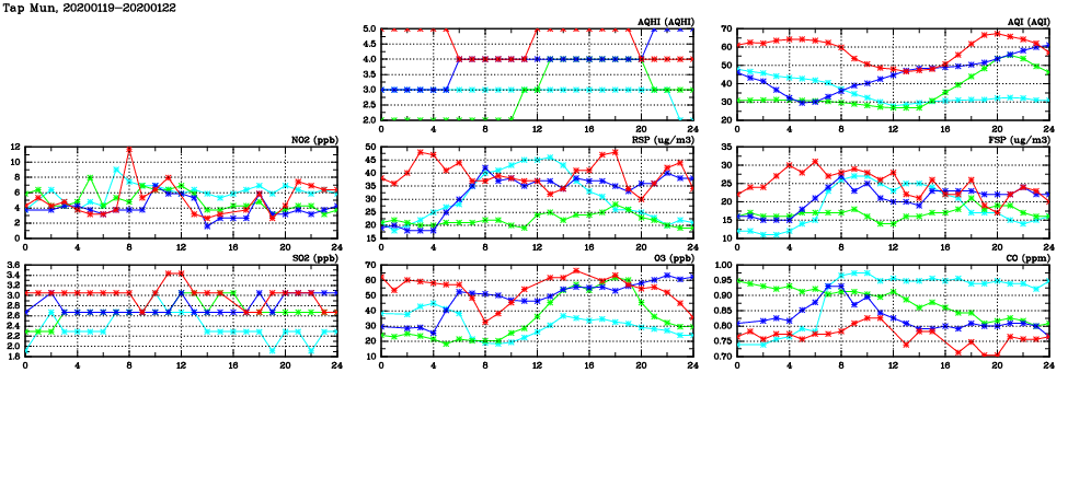 | Air Quality Data Time Series in Tap Mun (2020/01/22) | ( Line colors: Day -3 Day -2 Day -1 Current day ) | 2D Map Current AQHI |