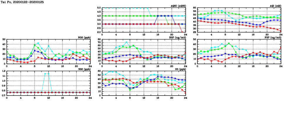 | Air Quality Data Time Series in Tai Po (2020/01/25) | ( Line colors: Day -3 Day -2 Day -1 Current day ) | 2D Map Current AQHI |