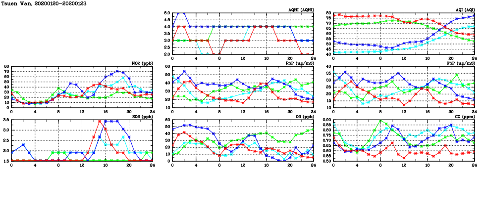 | Air Quality Data Time Series in Tsuen Wan (2020/01/23) | ( Line colors: Day -3 Day -2 Day -1 Current day ) | 2D Map Current AQHI |