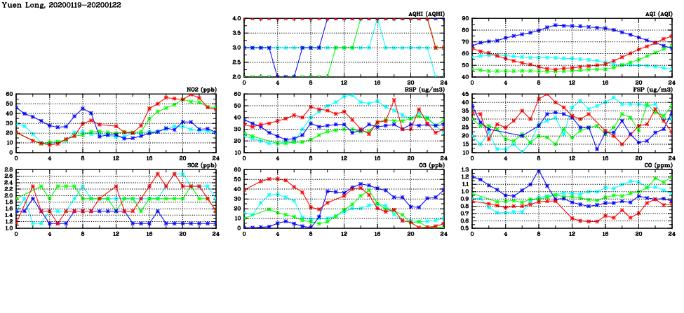 | Air Quality Data Time Series in Yuen Long (2020/01/22) | ( Line colors: Day -3 Day -2 Day -1 Current day ) | 2D Map Current AQHI |