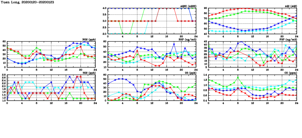 | Air Quality Data Time Series in Yuen Long (2020/01/23) | ( Line colors: Day -3 Day -2 Day -1 Current day ) | 2D Map Current AQHI |
