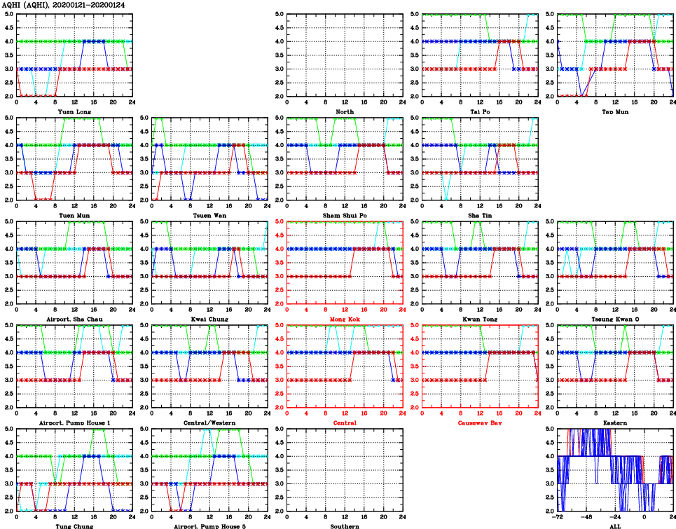 | Air Quality Data Time Series for AQHI (2020/01/24) | ( Line colors: Day -3 Day -2 Day -1 Current day ) | 2D Map Current AQHI |