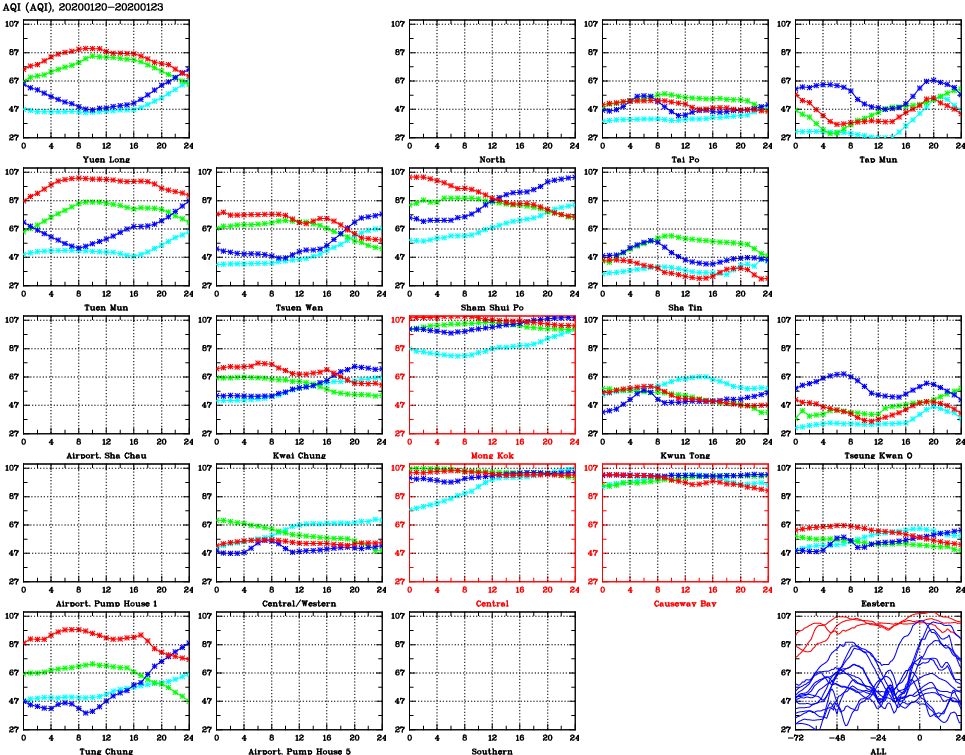 | Air Quality Data Time Series for AQI (2020/01/23) | ( Line colors: Day -3 Day -2 Day -1 Current day ) | 2D Map Current AQHI |
