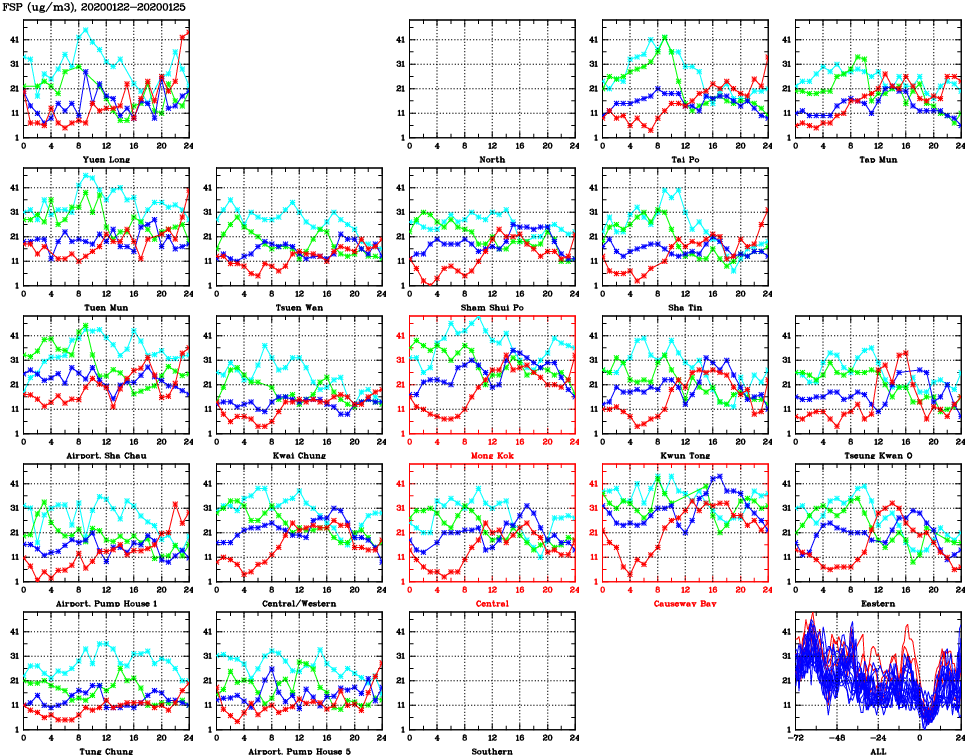 | Air Quality Data Time Series for FSP (2020/01/25) | ( Line colors: Day -3 Day -2 Day -1 Current day ) | 2D Map Current AQHI |