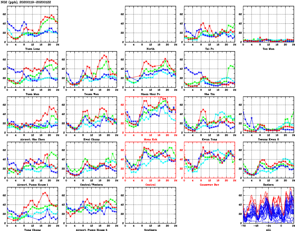 | Air Quality Data Time Series for NO2 (2020/01/22) | ( Line colors: Day -3 Day -2 Day -1 Current day ) | 2D Map Current AQHI |