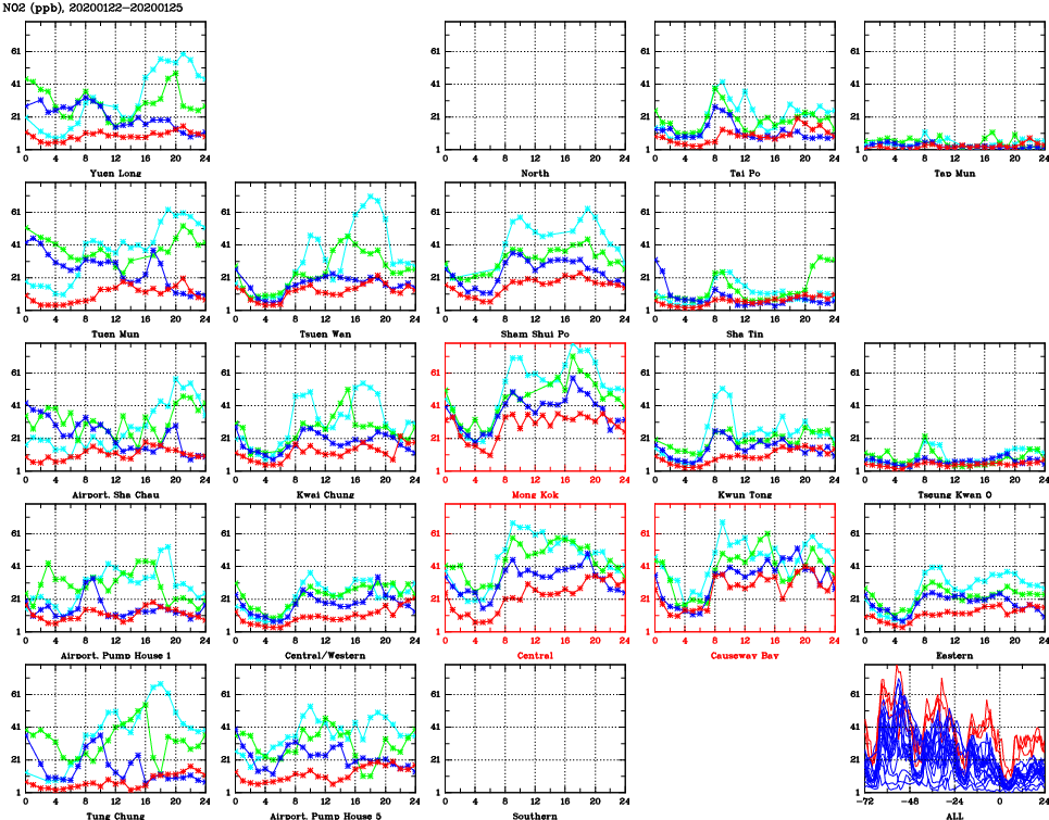 | Air Quality Data Time Series for NO2 (2020/01/25) | ( Line colors: Day -3 Day -2 Day -1 Current day ) | 2D Map Current AQHI |
