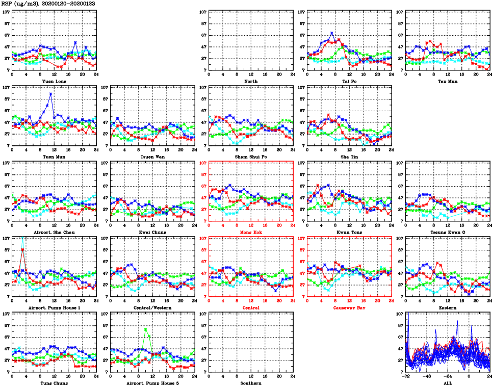 | Air Quality Data Time Series for RSP (2020/01/23) | ( Line colors: Day -3 Day -2 Day -1 Current day ) | 2D Map Current AQHI |