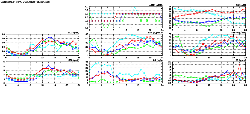 | Air Quality Data Time Series in Causeway Bay (2020/01/28) | ( Line colors: Day -3 Day -2 Day -1 Current day ) | 2D Map Current AQHI |