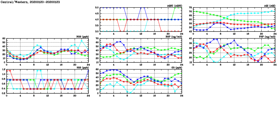 | Air Quality Data Time Series in Central/Western (2020/01/23) | ( Line colors: Day -3 Day -2 Day -1 Current day ) | 2D Map Current AQHI |