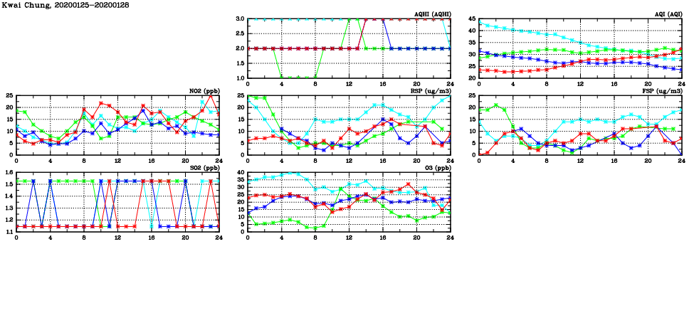 | Air Quality Data Time Series in Kwai Chung (2020/01/28) | ( Line colors: Day -3 Day -2 Day -1 Current day ) | 2D Map Current AQHI |