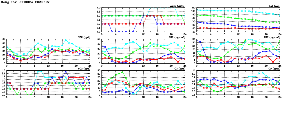 | Air Quality Data Time Series in Mong Kok (2020/01/27) | ( Line colors: Day -3 Day -2 Day -1 Current day ) | 2D Map Current AQHI |