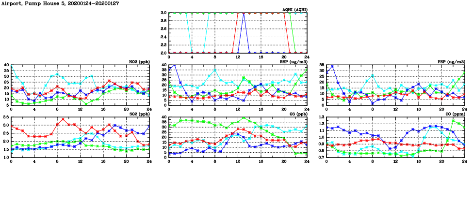 | Air Quality Data Time Series in Airport, Pump House 5 (2020/01/27) | ( Line colors: Day -3 Day -2 Day -1 Current day ) | 2D Map Current AQHI |