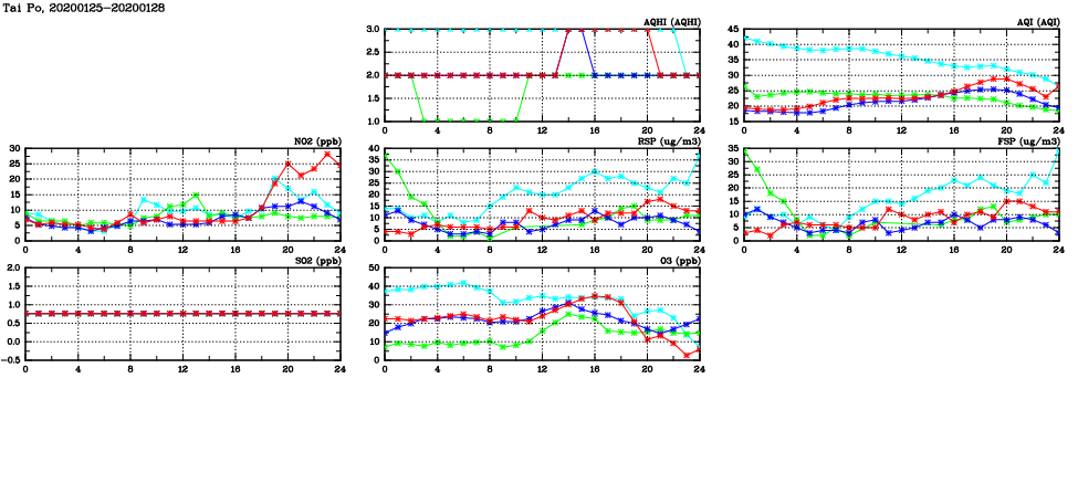 | Air Quality Data Time Series in Tai Po (2020/01/28) | ( Line colors: Day -3 Day -2 Day -1 Current day ) | 2D Map Current AQHI |