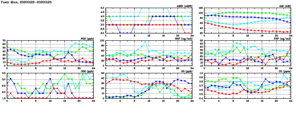 | Air Quality Data Time Series in Tuen Mun (2020/01/25) | ( Line colors: Day -3 Day -2 Day -1 Current day ) | 2D Map Current AQHI |