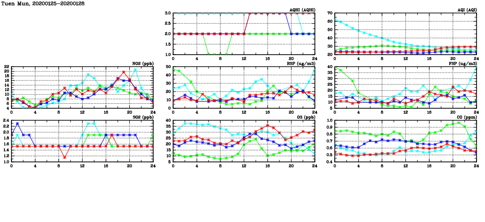 | Air Quality Data Time Series in Tuen Mun (2020/01/28) | ( Line colors: Day -3 Day -2 Day -1 Current day ) | 2D Map Current AQHI |