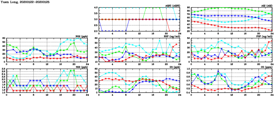 | Air Quality Data Time Series in Yuen Long (2020/01/25) | ( Line colors: Day -3 Day -2 Day -1 Current day ) | 2D Map Current AQHI |