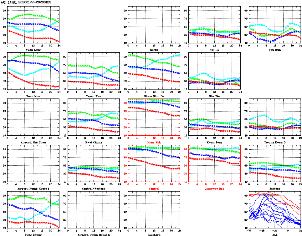 | Air Quality Data Time Series for AQI (2020/01/25) | ( Line colors: Day -3 Day -2 Day -1 Current day ) | 2D Map Current AQHI |