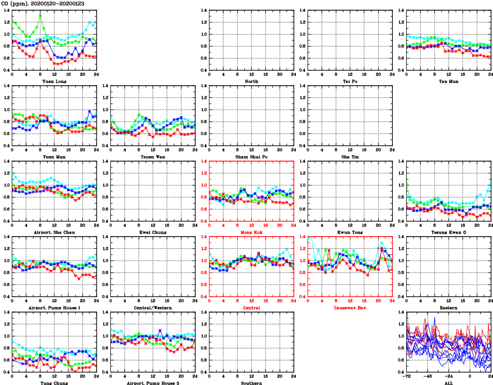 | Air Quality Data Time Series for CO (2020/01/23) | ( Line colors: Day -3 Day -2 Day -1 Current day ) | 2D Map Current AQHI |