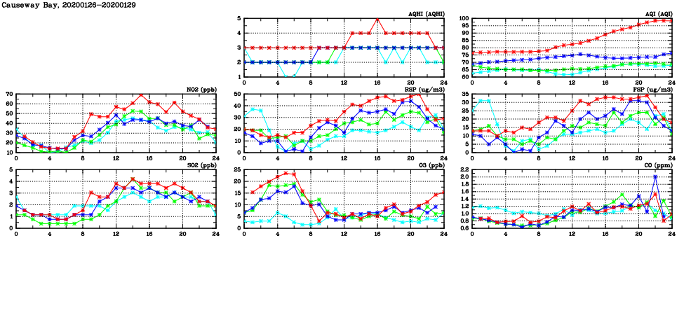 | Air Quality Data Time Series in Causeway Bay (2020/01/29) | ( Line colors: Day -3 Day -2 Day -1 Current day ) | 2D Map Current AQHI |