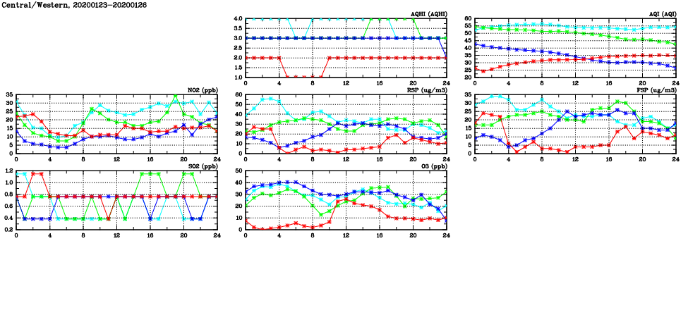| Air Quality Data Time Series in Central/Western (2020/01/26) | ( Line colors: Day -3 Day -2 Day -1 Current day ) | 2D Map Current AQHI |