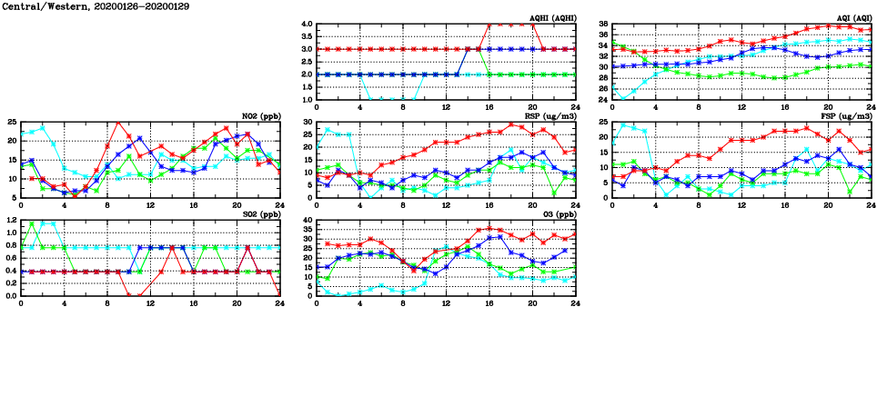 | Air Quality Data Time Series in Central/Western (2020/01/29) | ( Line colors: Day -3 Day -2 Day -1 Current day ) | 2D Map Current AQHI |