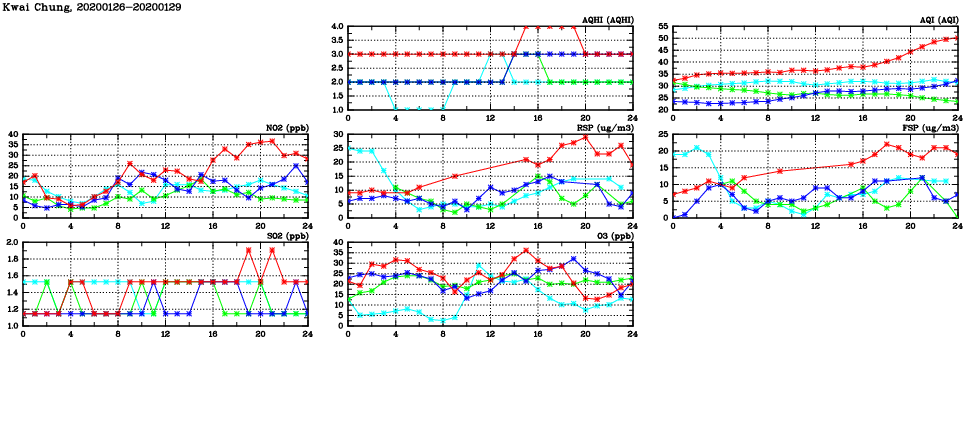 | Air Quality Data Time Series in Kwai Chung (2020/01/29) | ( Line colors: Day -3 Day -2 Day -1 Current day ) | 2D Map Current AQHI |