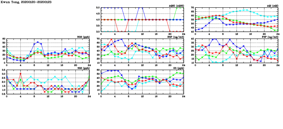 | Air Quality Data Time Series in Kwun Tong (2020/01/23) | ( Line colors: Day -3 Day -2 Day -1 Current day ) | 2D Map Current AQHI |