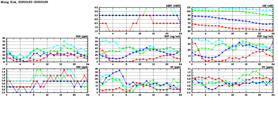 | Air Quality Data Time Series in Mong Kok (2020/01/26) | ( Line colors: Day -3 Day -2 Day -1 Current day ) | 2D Map Current AQHI |