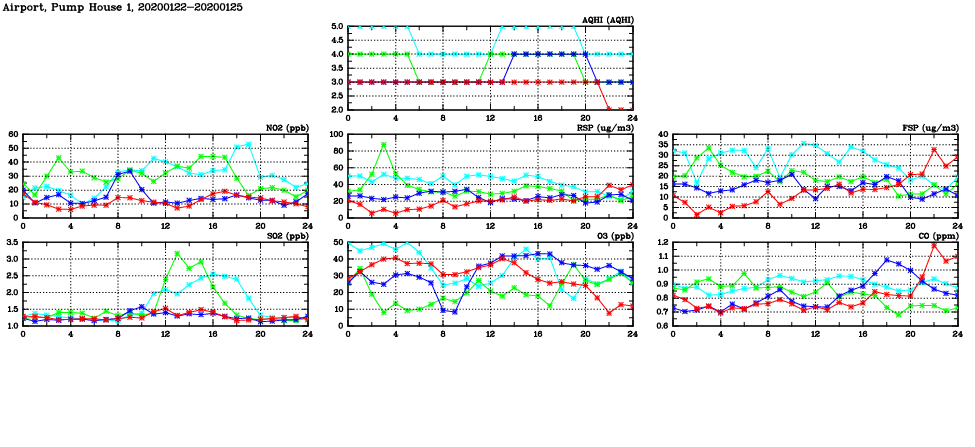 | Air Quality Data Time Series in Airport, Pump House 1 (2020/01/25) | ( Line colors: Day -3 Day -2 Day -1 Current day ) | 2D Map Current AQHI |