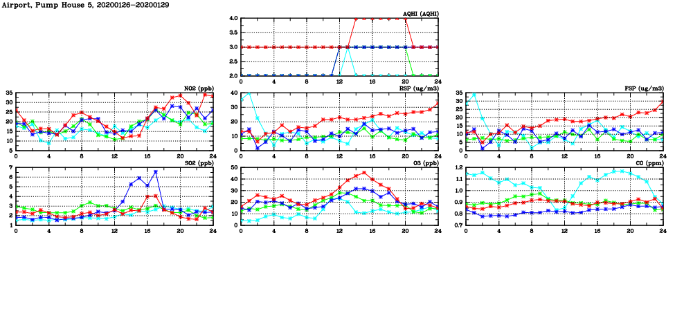 | Air Quality Data Time Series in Airport, Pump House 5 (2020/01/29) | ( Line colors: Day -3 Day -2 Day -1 Current day ) | 2D Map Current AQHI |