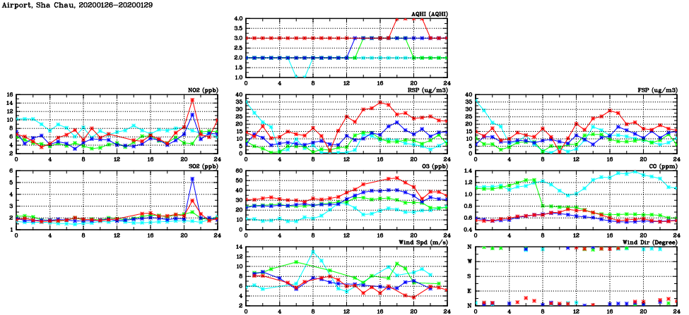 | Air Quality Data Time Series in Airport, Sha Chau (2020/01/29) | ( Line colors: Day -3 Day -2 Day -1 Current day ) | 2D Map Current AQHI |