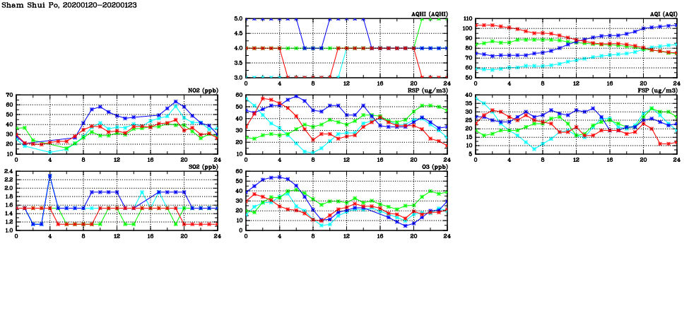 | Air Quality Data Time Series in Sham Shui Po (2020/01/23) | ( Line colors: Day -3 Day -2 Day -1 Current day ) | 2D Map Current AQHI |