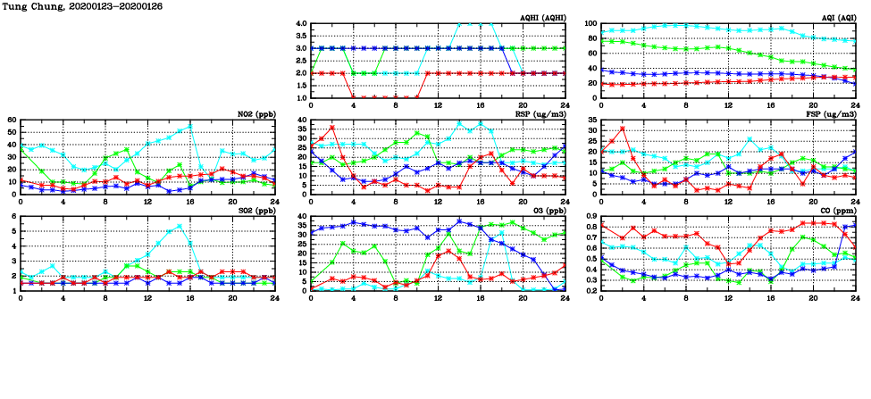 | Air Quality Data Time Series in Tung Chung (2020/01/26) | ( Line colors: Day -3 Day -2 Day -1 Current day ) | 2D Map Current AQHI |