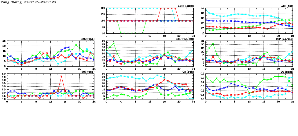 | Air Quality Data Time Series in Tung Chung (2020/01/28) | ( Line colors: Day -3 Day -2 Day -1 Current day ) | 2D Map Current AQHI |