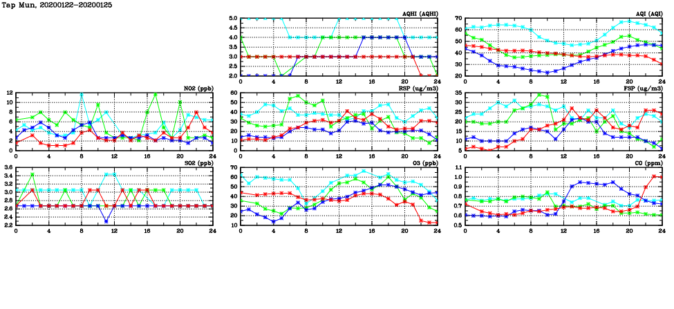 | Air Quality Data Time Series in Tap Mun (2020/01/25) | ( Line colors: Day -3 Day -2 Day -1 Current day ) | 2D Map Current AQHI |