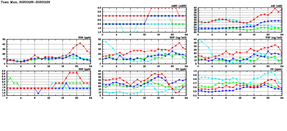 | Air Quality Data Time Series in Tuen Mun (2020/01/29) | ( Line colors: Day -3 Day -2 Day -1 Current day ) | 2D Map Current AQHI |