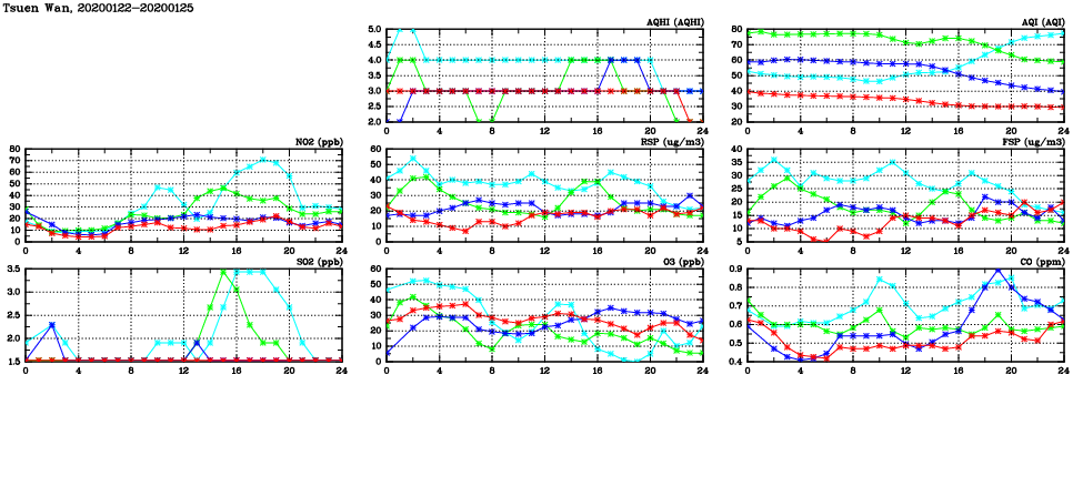 | Air Quality Data Time Series in Tsuen Wan (2020/01/25) | ( Line colors: Day -3 Day -2 Day -1 Current day ) | 2D Map Current AQHI |