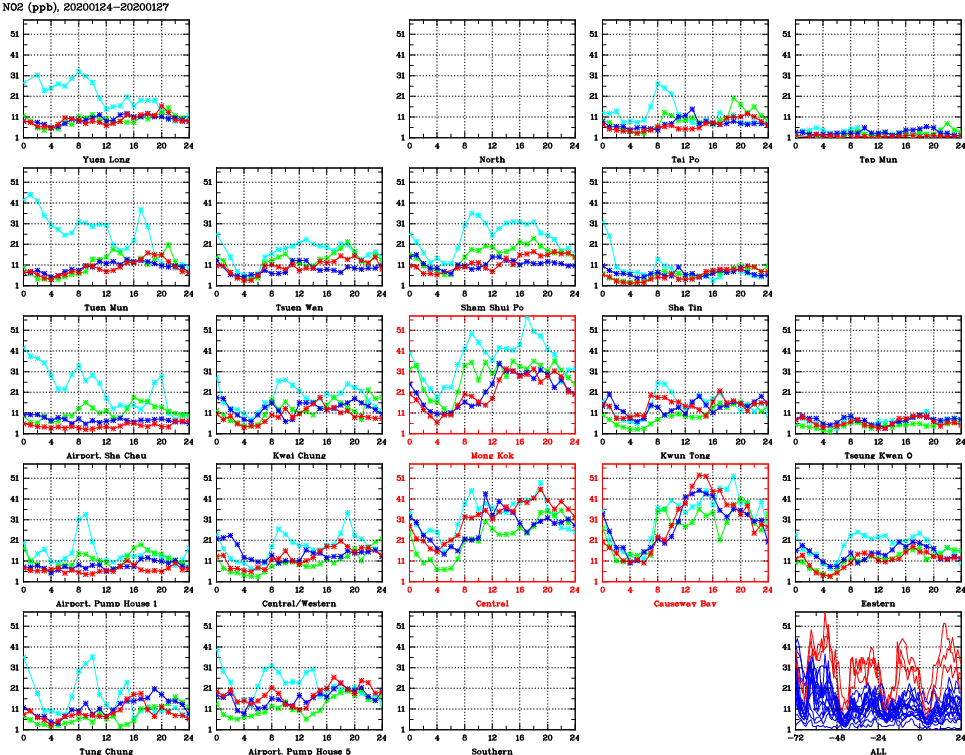 | Air Quality Data Time Series for NO2 (2020/01/27) | ( Line colors: Day -3 Day -2 Day -1 Current day ) | 2D Map Current AQHI |