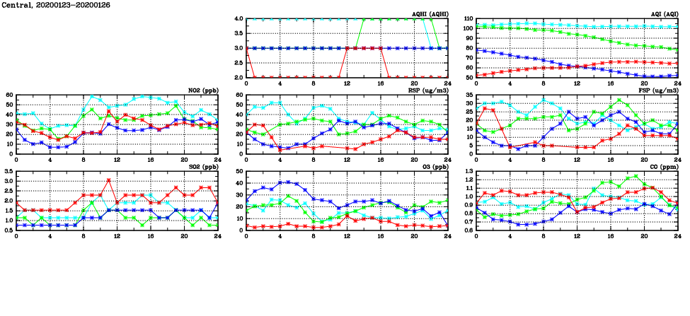 | Air Quality Data Time Series in Central (2020/01/26) | ( Line colors: Day -3 Day -2 Day -1 Current day ) | 2D Map Current AQHI |