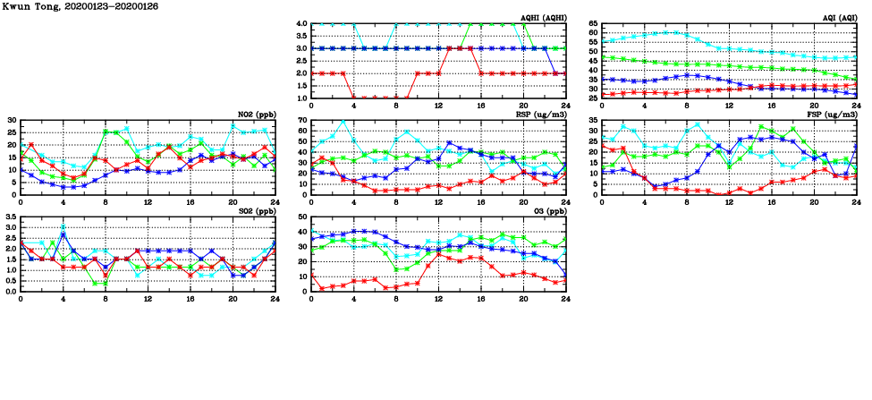 | Air Quality Data Time Series in Kwun Tong (2020/01/26) | ( Line colors: Day -3 Day -2 Day -1 Current day ) | 2D Map Current AQHI |