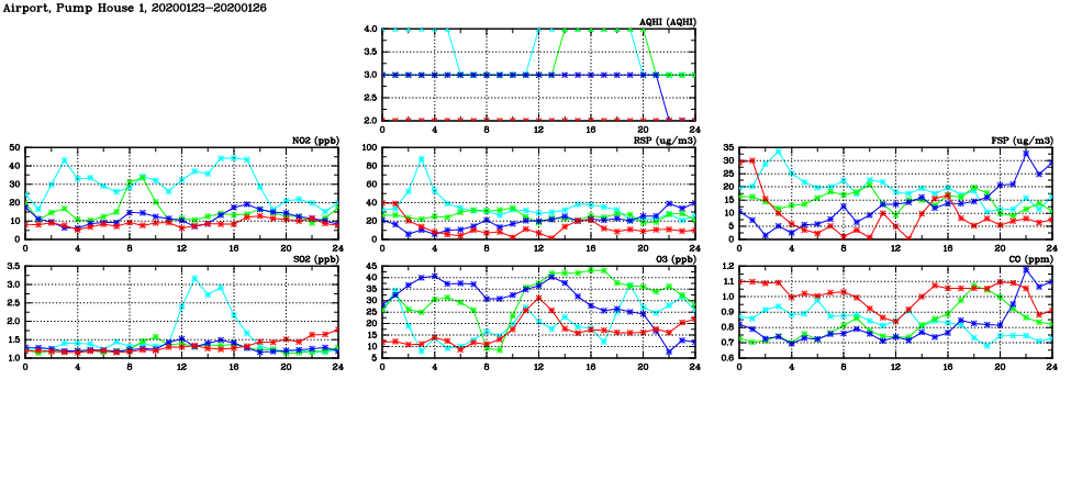 | Air Quality Data Time Series in Airport, Pump House 1 (2020/01/26) | ( Line colors: Day -3 Day -2 Day -1 Current day ) | 2D Map Current AQHI |