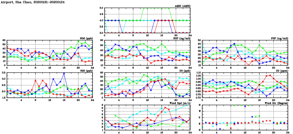 | Air Quality Data Time Series in Airport, Sha Chau (2020/01/24) | ( Line colors: Day -3 Day -2 Day -1 Current day ) | 2D Map Current AQHI |